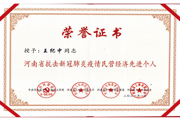 4月,河南省抗擊新冠肺炎疫情民營(yíng)經(jīng)濟(jì)*個(gè)人評(píng)選表彰活動(dòng)中,聯(lián)合授予長(zhǎng)城機(jī)械董事長(zhǎng)王紀(jì)中河南省抗擊新冠肺炎疫情民營(yíng)經(jīng)濟(jì)*個(gè)人。
