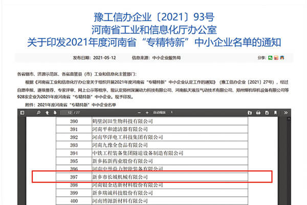 5月,新鄉(xiāng)市長(zhǎng)城機(jī)械有限公司憑借過硬的綜合實(shí)力成功入選2021年度河南省“專精特新”中小企業(yè)名單。