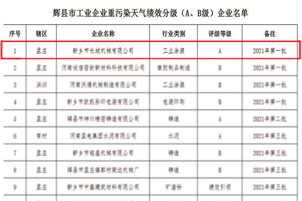 9月,新鄉(xiāng)市長(zhǎng)城機(jī)械有限公司順利通過第一批省環(huán)保廳A級(jí)企業(yè)績(jī)效評(píng)定。